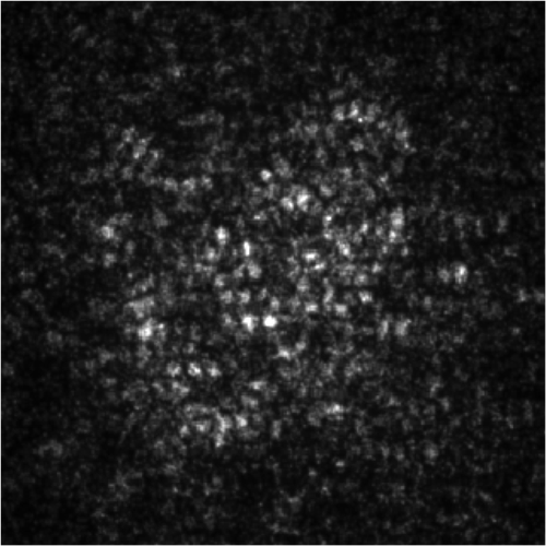| Рис.1. Спекл-структура изображения звезды в телескопе БТА при регистрации с короткой экспозицией (20 мс) в фильтре шириной 20 нм. Размер кадра 2х2 угл. секунды. |