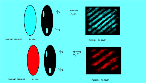 | Рис.2. Формирование интерференционных полос при наложении непрозрачного экрана с двумя отверстиями на зрачок. |