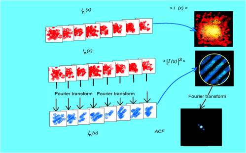 Основы метода были изложены в работе A.Labeyrie (1970). В спекл-интерферометрии при регистрации изображений используются короткие экспозиции, ~ 0.01. сек, что позволяет «заморозить» искаженную атмосферой картинку. В отличие от простого накопления изображения, которое применяется в обычных наблюдениях на телескопе, в спекл-интерферометрии накапливается длинная серия, обычно несколько тысяч кадров, отдельных коротко-экспозиционных снимков. В последующем для каждого из снимков с помощью Фурье-преобразования вычисляется его 2-мерный спектр мощности – картинка, казывающая, с каким весом каждая пространственная частота входит в исходное изображение. Оказывается, что при коротких экспозициях самые высокие пространственные частоты, соответствующие дифракционному пределу на апертуре, сохраняются в «замороженном» изображении. В Фурье-плоскости эти высокие частоты присутствуют с очень малой амплитудой, но накопление нескольких тысяч Фурье-преобразований позволяет повысить отношение сигнала к шуму до значений, необходимых для однозначного восстановления тонкой структуры изображения. На рис.4 схематически показано различие между обычным накоплением (усреднением) изображения и усреднением спектров мощности по методу Лабейри.